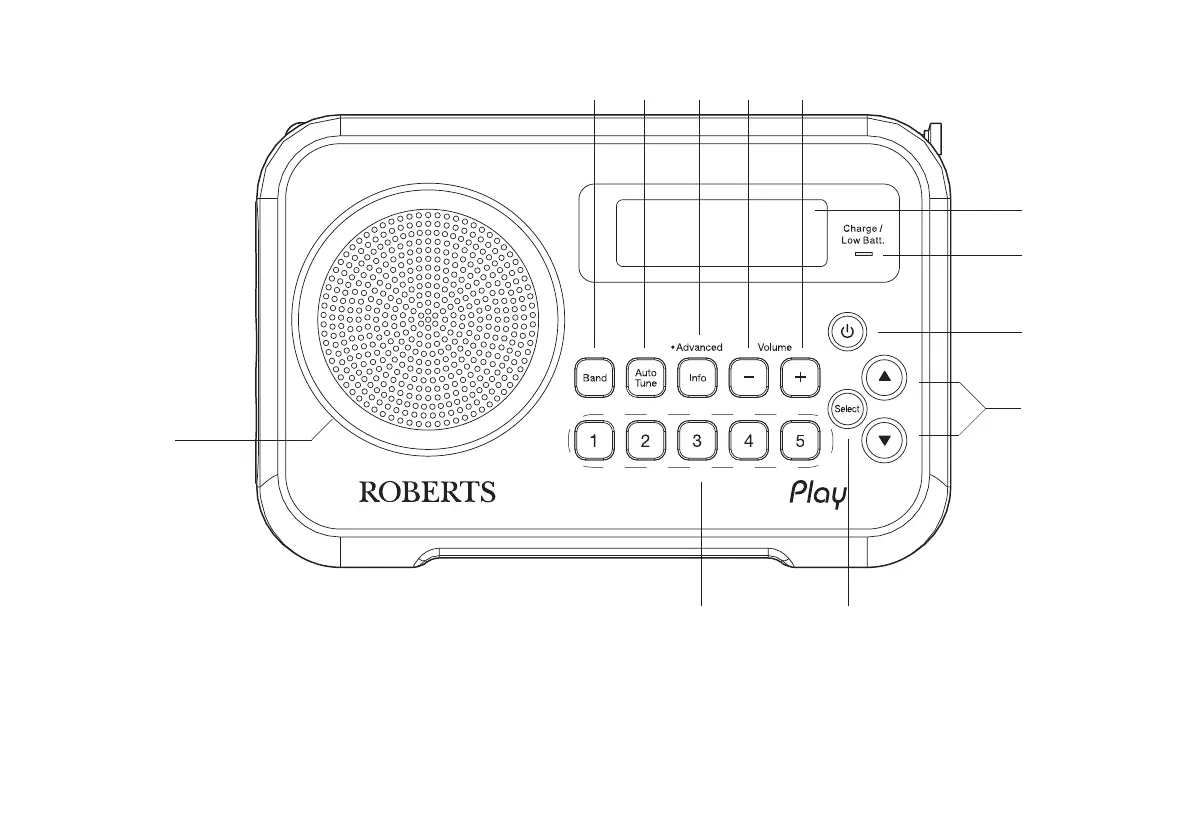 Roberts Play - Front Panel Controls; Navigation and Station Selection; Power and Volume Adjustment; Display and Indicators