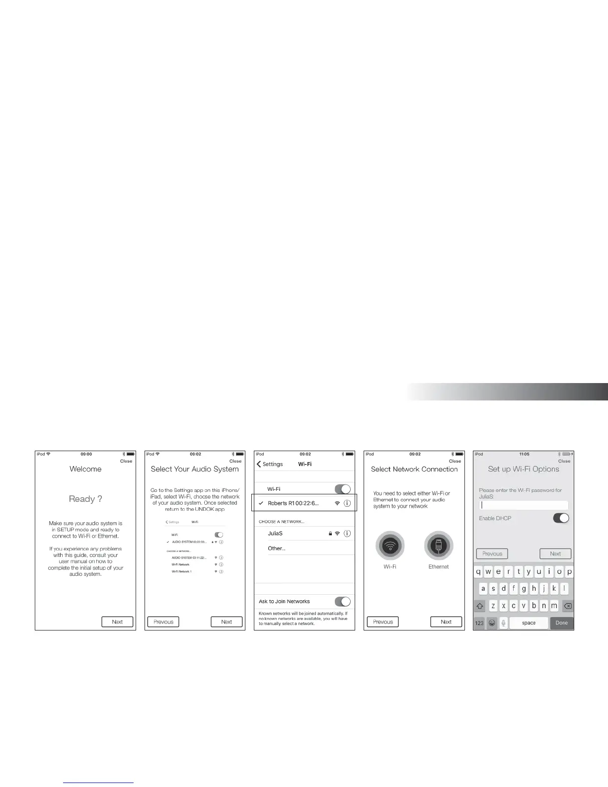 The UNDOK app has a setup wizard to help confi gure suitable audio devices to connect to your home WiFi network.