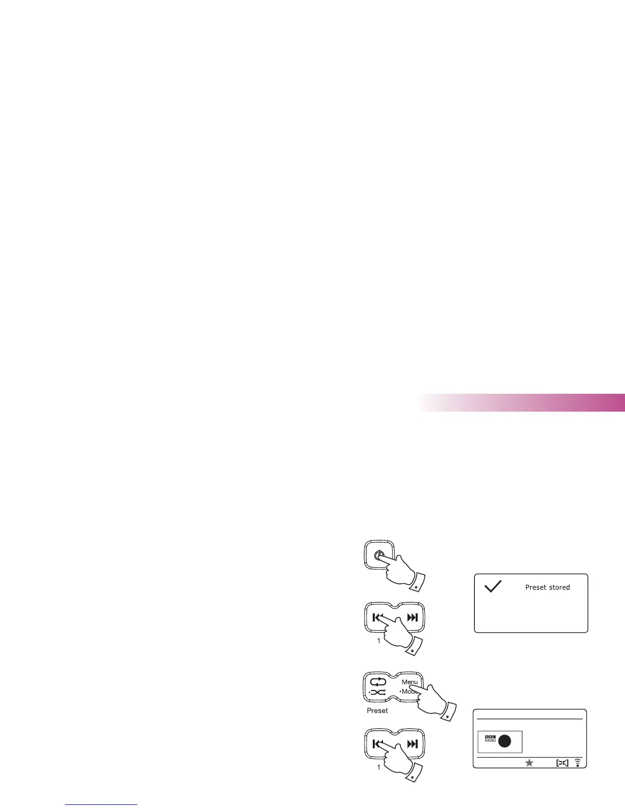 required Preset button (1 - 4) until the display shows 'Preset stored'. The station