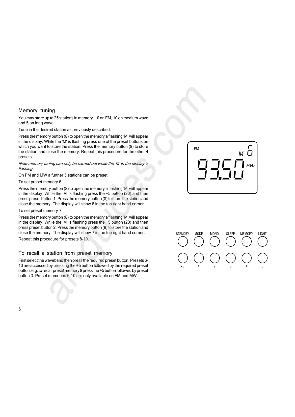 On FM and MW a further 5 stations can be preset.