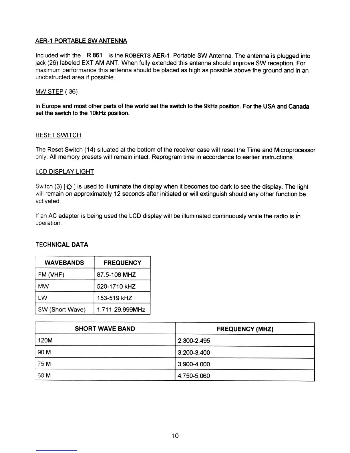 Roberts R861 - AER-1 Portable SW Antenna; Reset Switch; LCD Display Light; Technical Data
