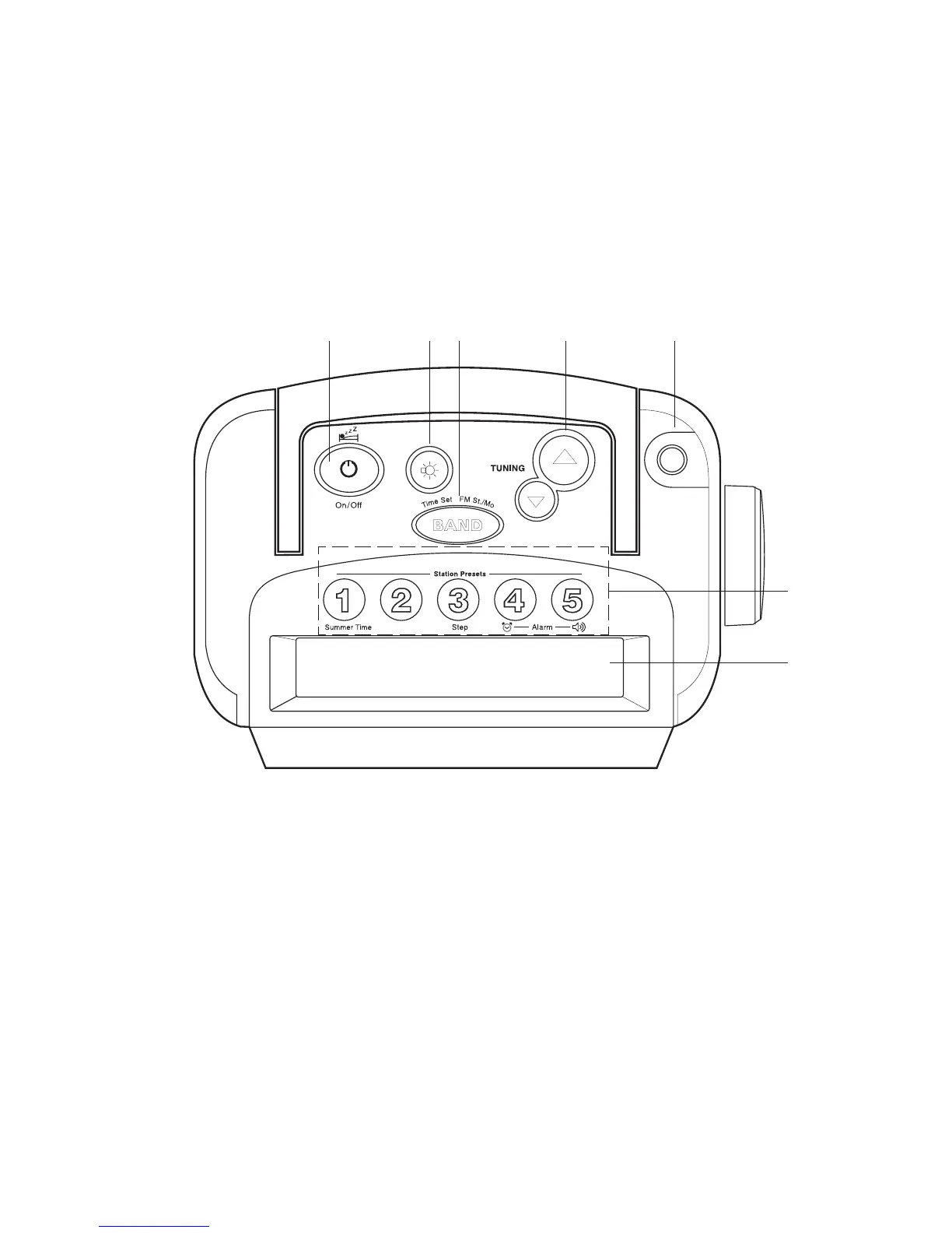 6. Preset, Summer time, Tuning step and Alarm set buttons