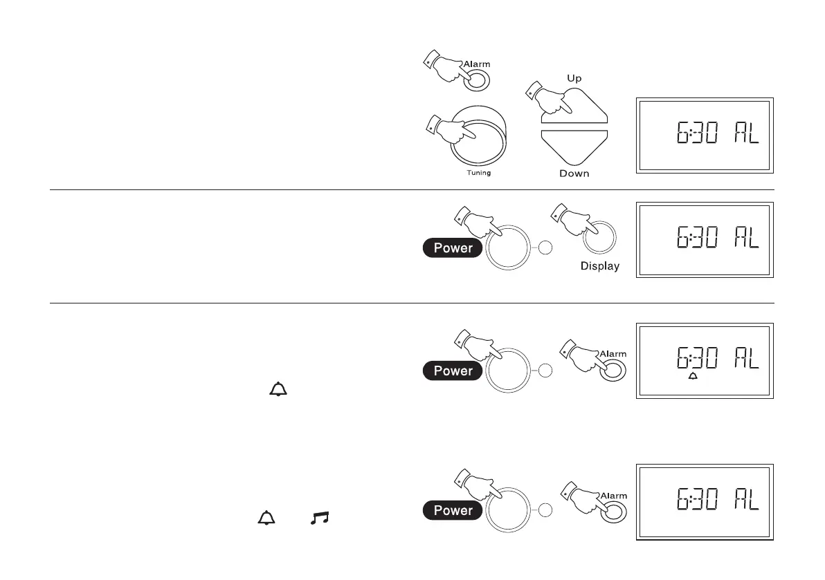 2. Press the Display button once to display alarm time. Clock time will