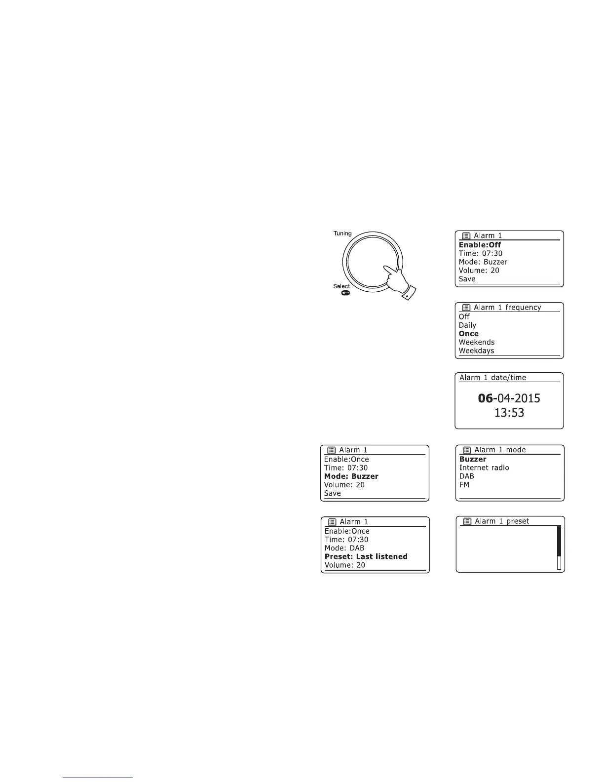 11. If setting the alarm to a radio option, rotate the Tuning/Select control