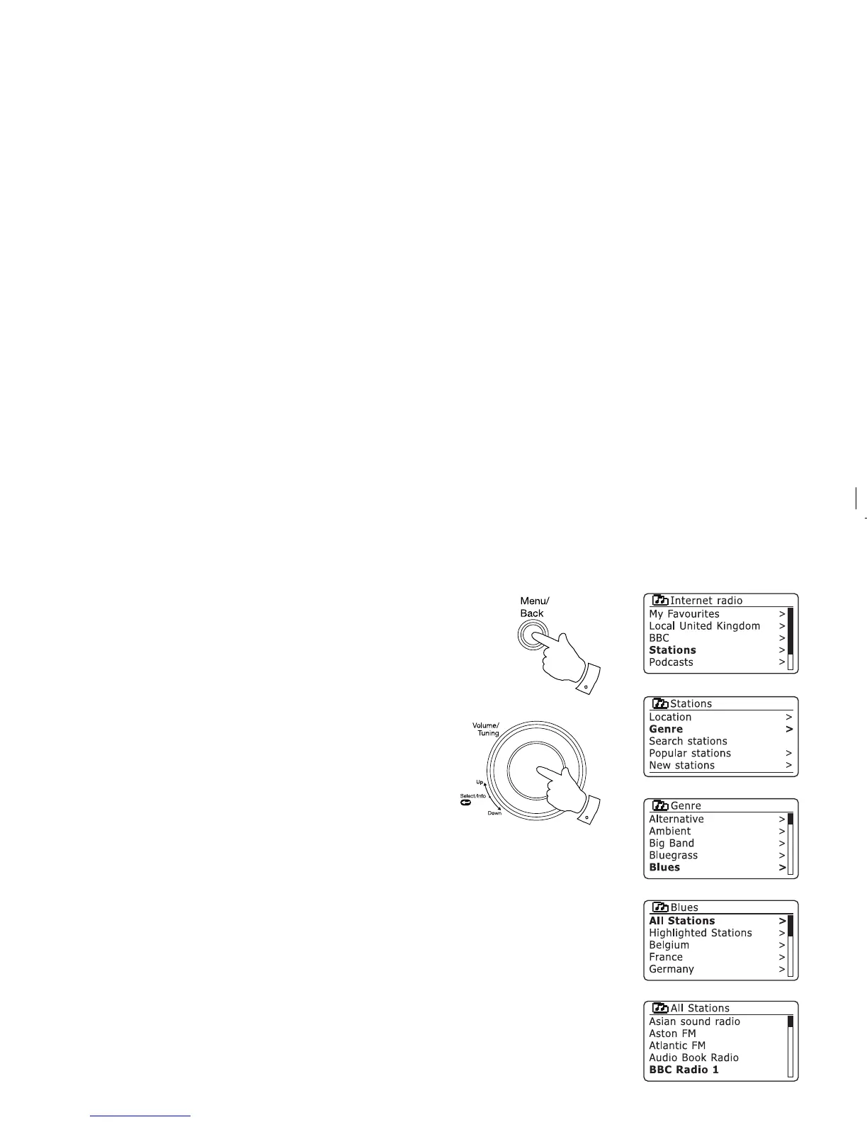1. Press and hold the Menu button to enter the main Internet radio menu.