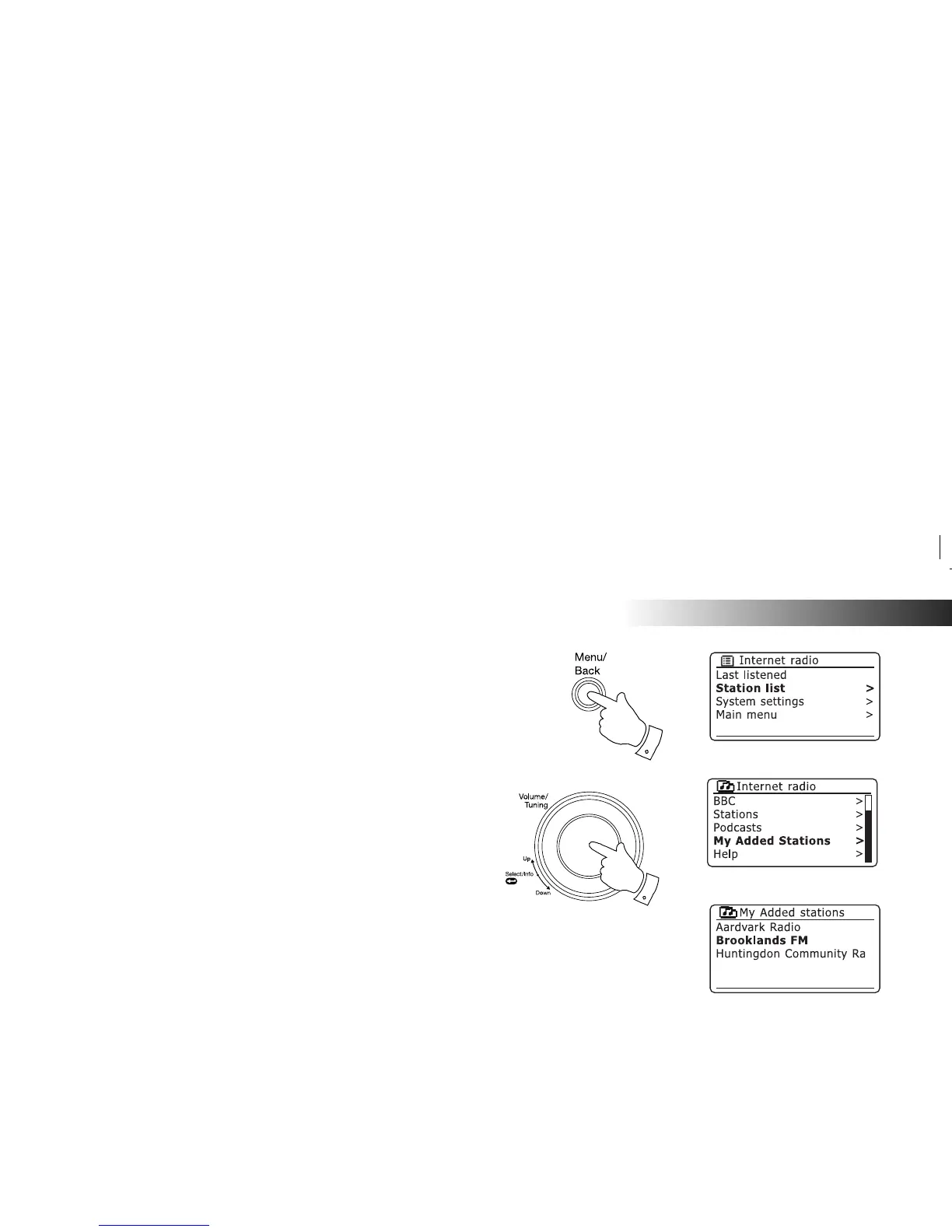 1. Press and hold the Menu button to enter the main Internet radio menu.