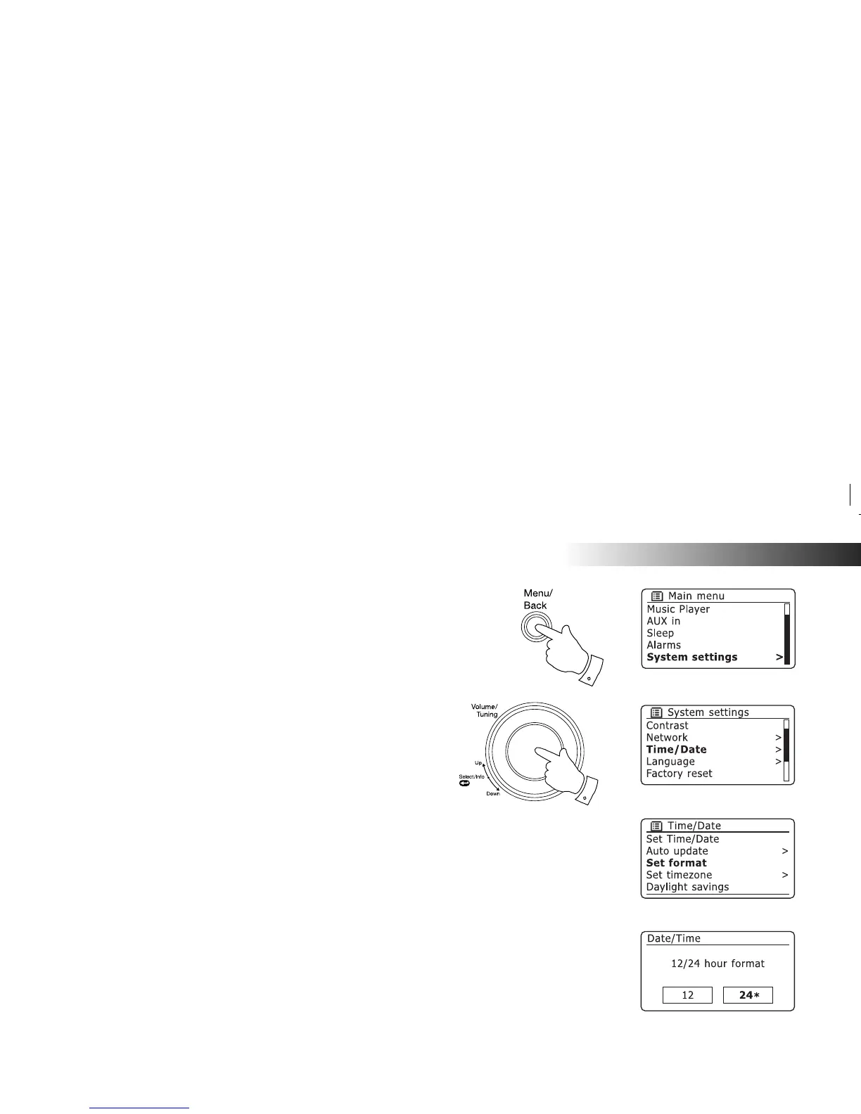 5. Rotate the Tuning/Select control to select either 12 or 24 hour format.