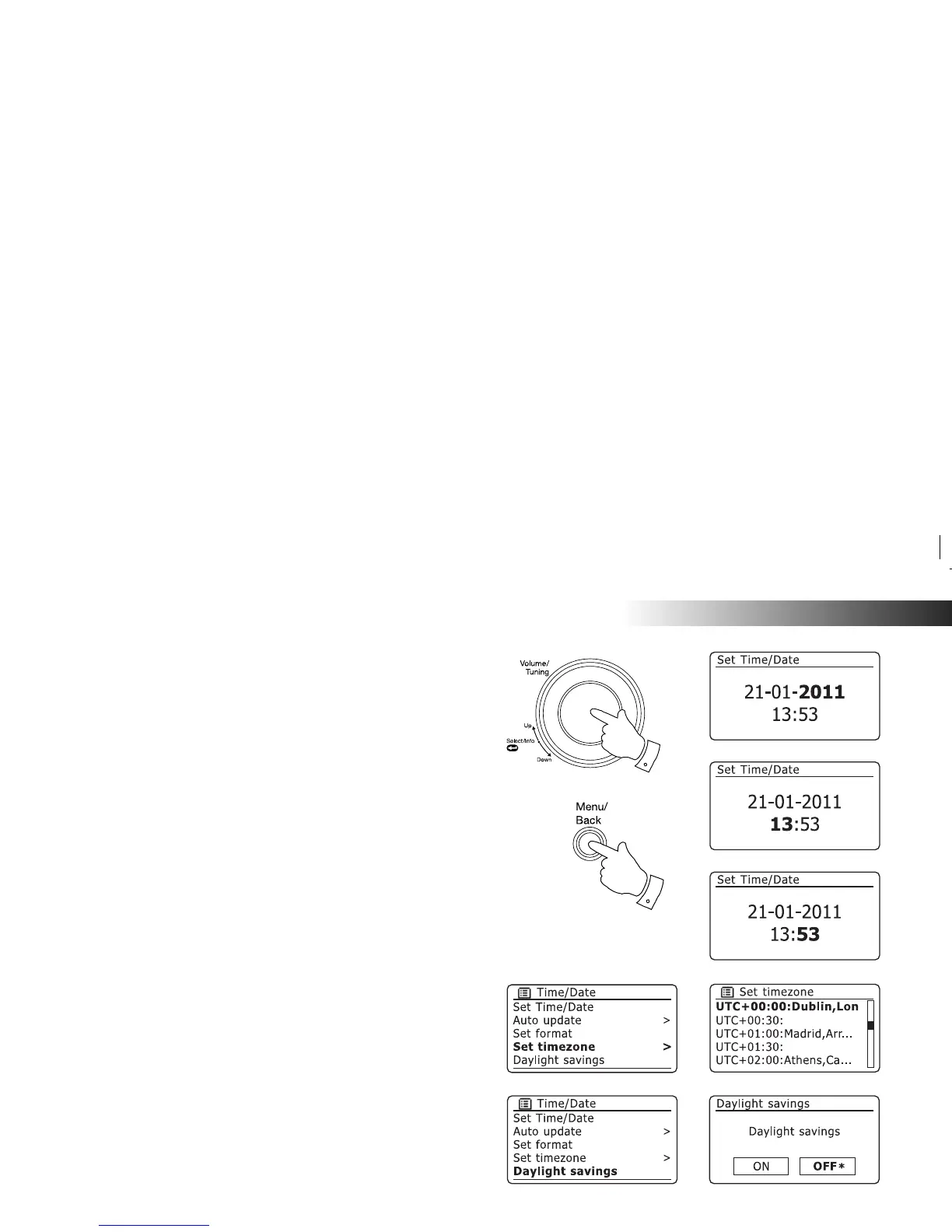 11. Rotate the Tuning/Select control until 'Set timezone' is highlighted