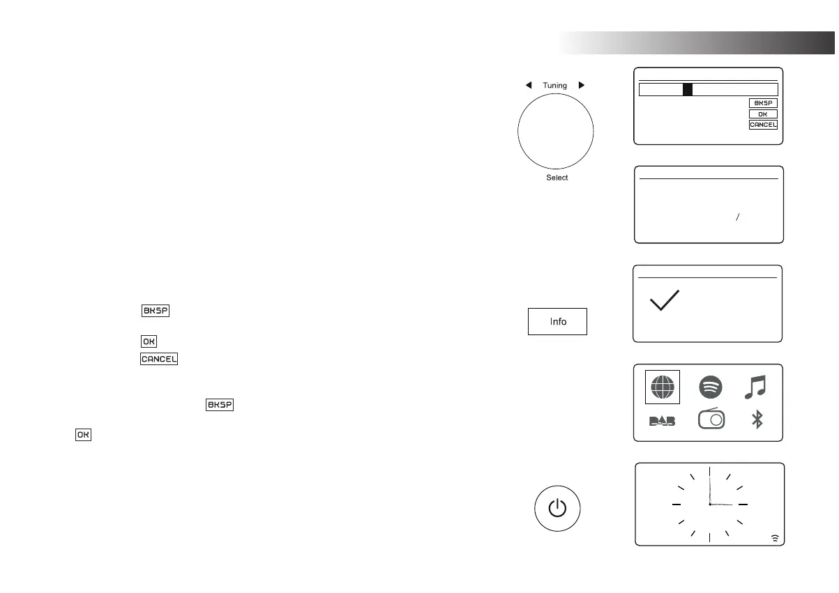 9. To enter the WEP or WPA key, characters are selected and entered using the Tuning