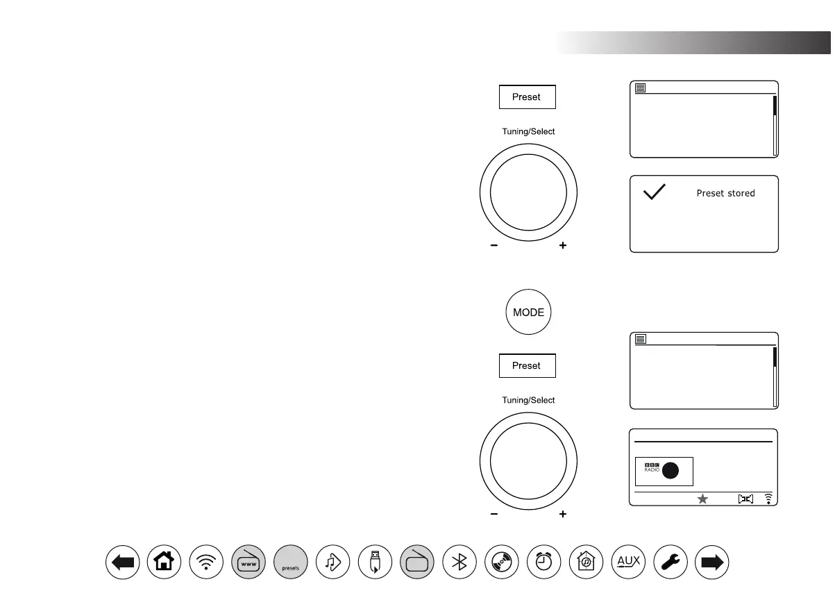 Tuning/Select control to store the preset. 'Preset stored' will be shown on