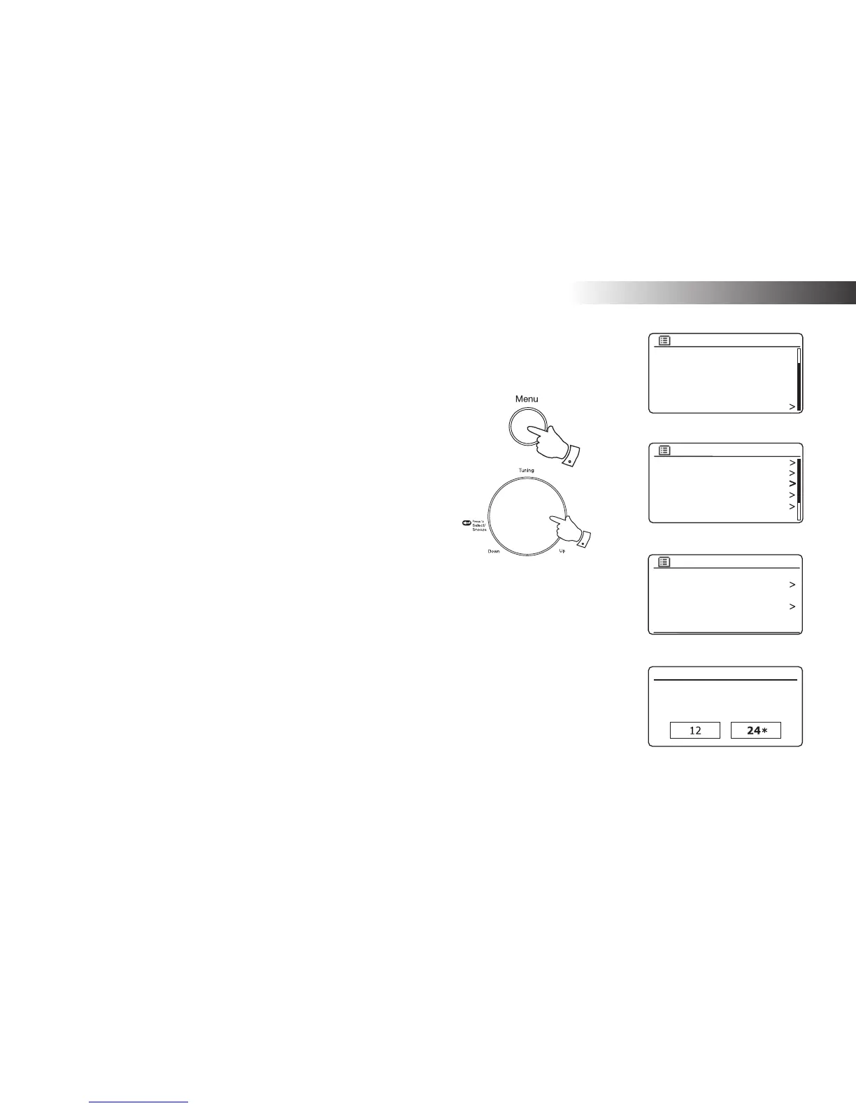 5. Rotate the Tuning/Select control to select either 12 or 24 hour format.
