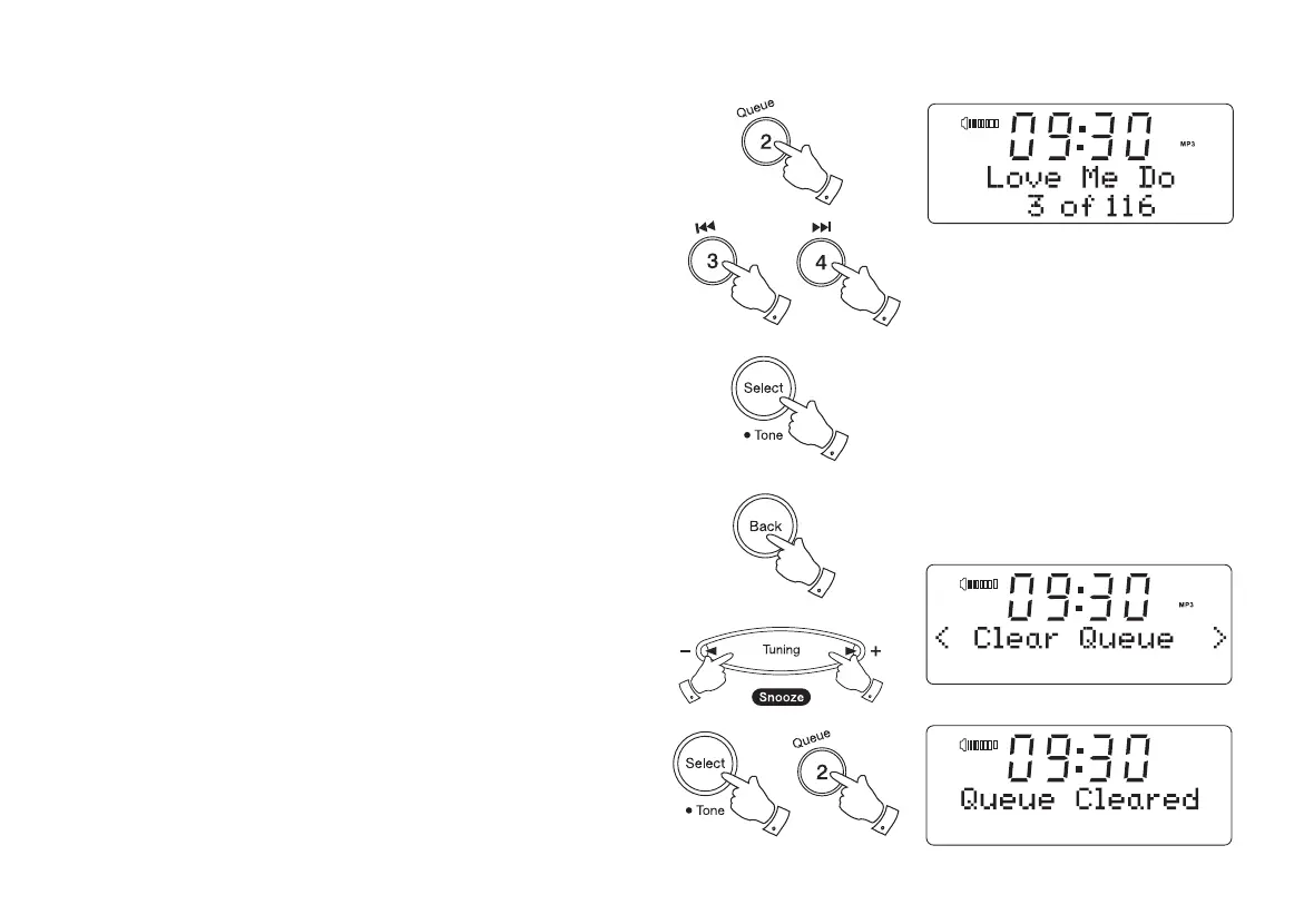 3. Press the Tuning Up or Down buttons until 'Clear Queue' is displayed.