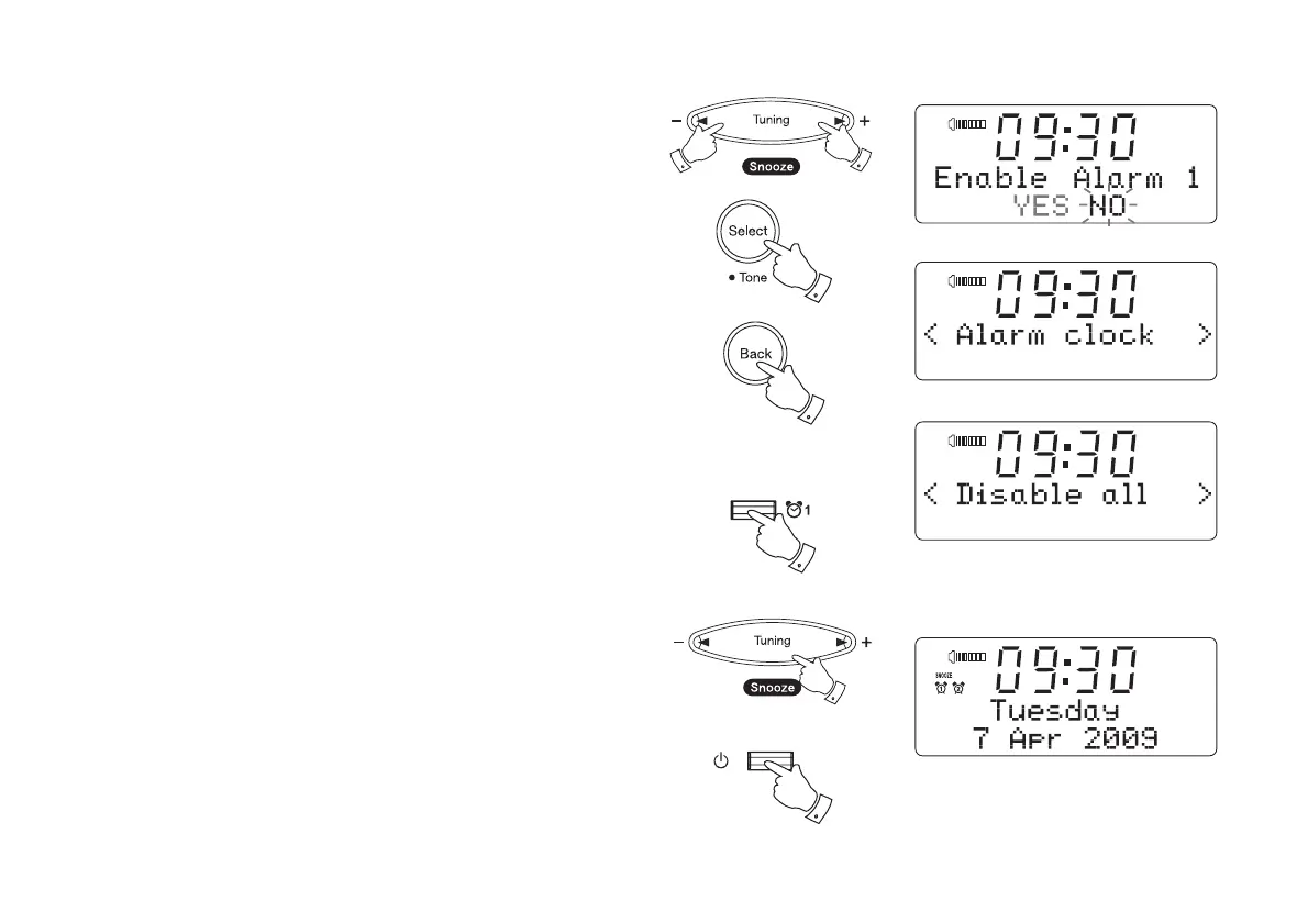 the Select button to confi rm. The display will show 'Alarm disabled'.