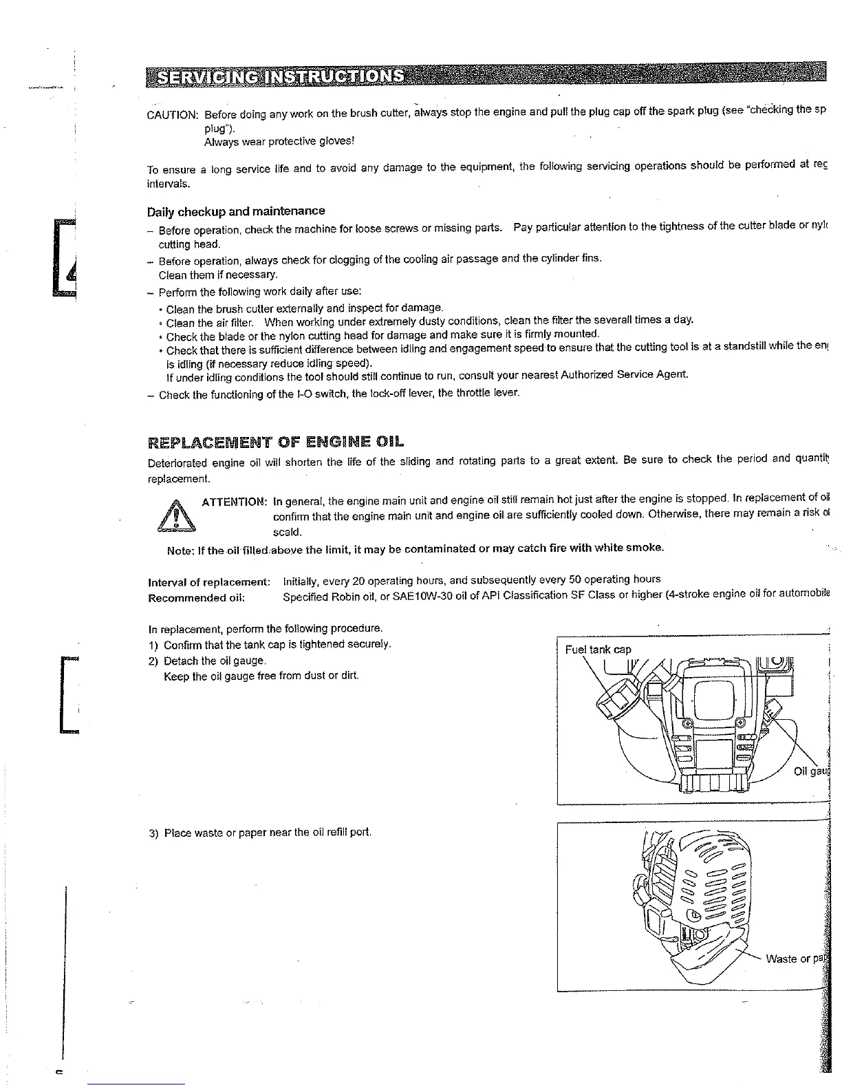 Robin BH3500 - SERVICING INSTRUCTIONS; Daily Maintenance Checks and Engine Oil Replacement