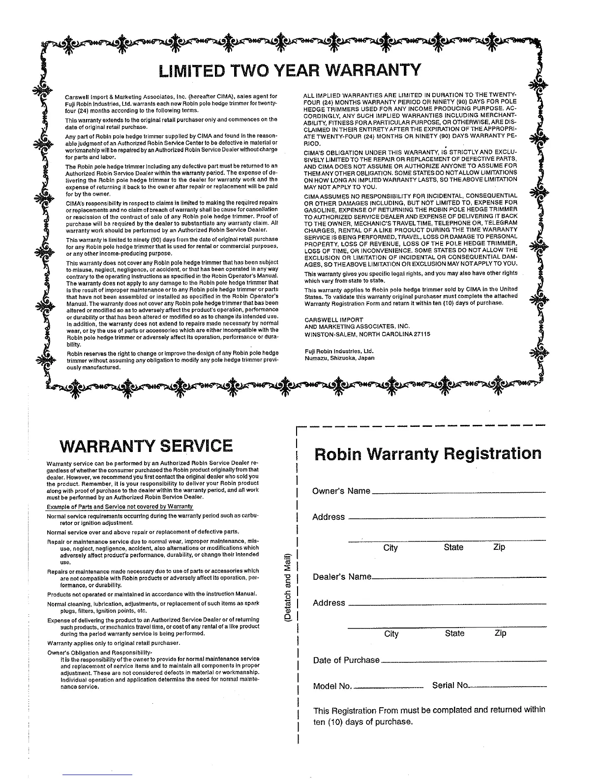Robin BP2501 - LIMITED TWO YEAR WARRANTY; Warranty Terms and Conditions