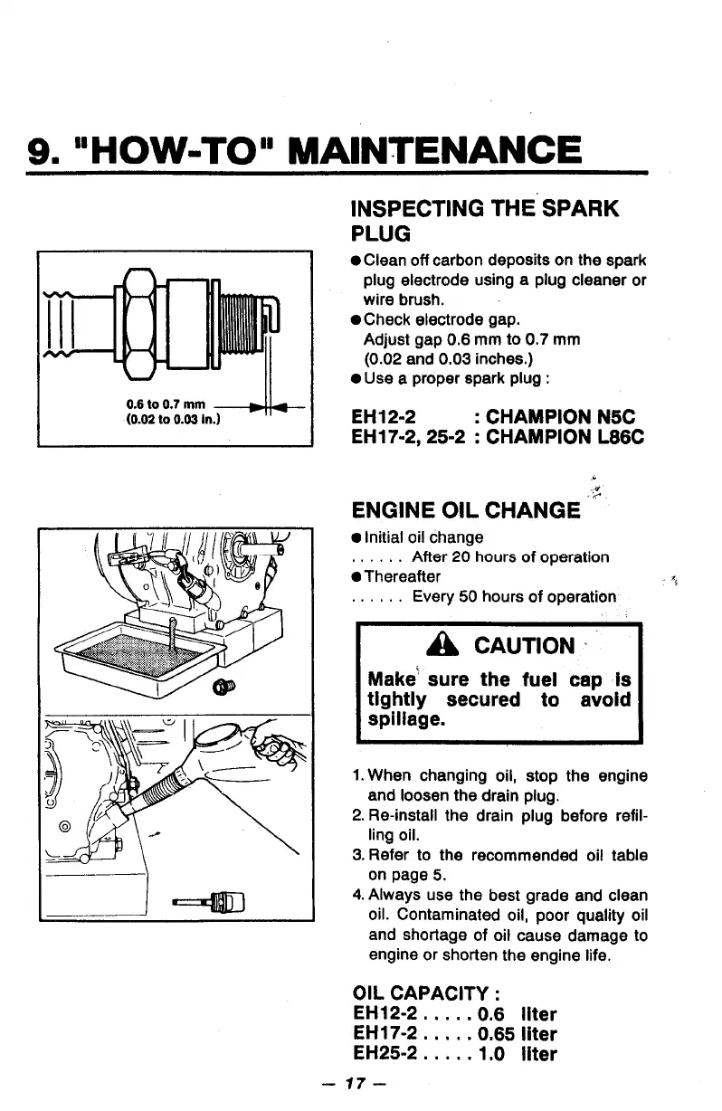 Robin EH25-2D - How-To Maintenance; Inspecting the Spark Plug; Engine Oil Change