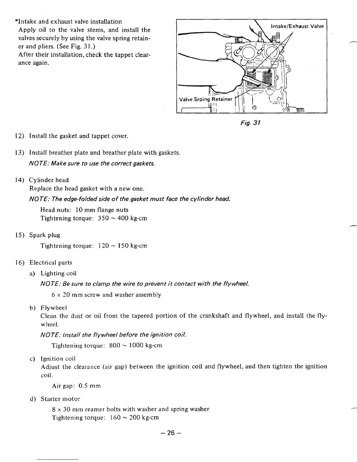 Adjust the clearance (air gap) between the ignition coil and flywheel, and then tighten the ignition