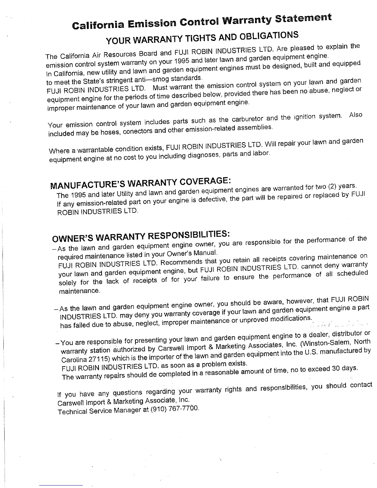 Robin FL500 - California Emission Control Warranty Statement