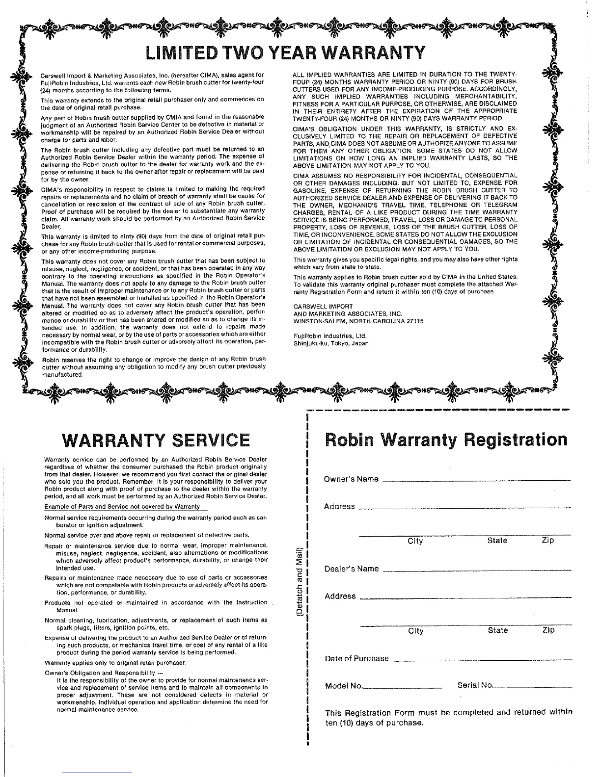 Robin NB02T - Limited Two Year Warranty; Warranty Service Details and Exclusions; Warranty Registration Process
