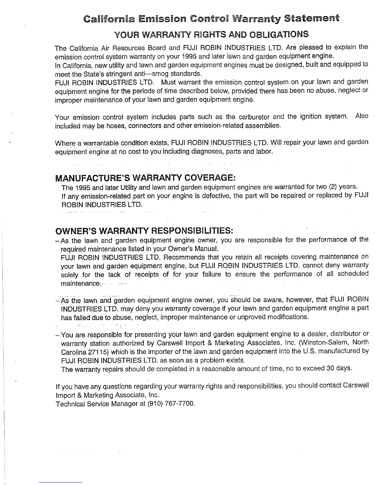Robin NB2001 - California Emission Control Warranty Statement; YOUR WARRANTY RIGHTS AND OBLIGATIONS; MANUFACTURES WARRANTY COVERAGE:; OWNERS WARRANTY RESPONSIBILITIES: