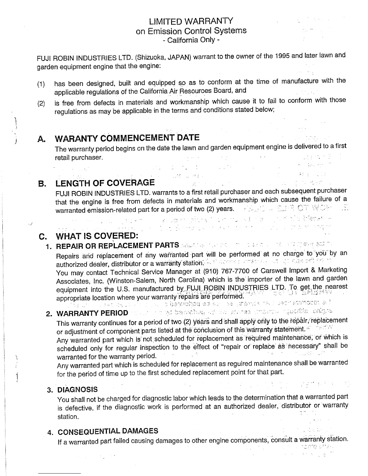 Robin NB2001 - LIMITED WARRANTY on Emission Control Systems - California Only -; A. WARANTY COMMENCEMENT DATE; B. LENGTH OF COVERAGE; C. WHAT IS COVERED: