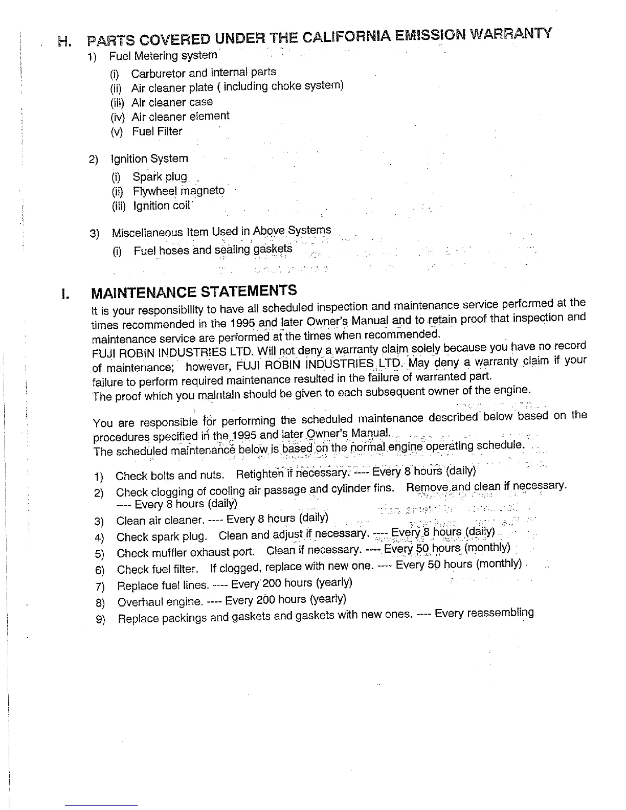 Robin NB2001 - H. PARTS COVERED UNDER THE CALIFORNIA EMISSION WARRANTY; 1. Fuel Metering system; 2. Ignition System; 3. Miscellaneous Item Used in Above Systems
