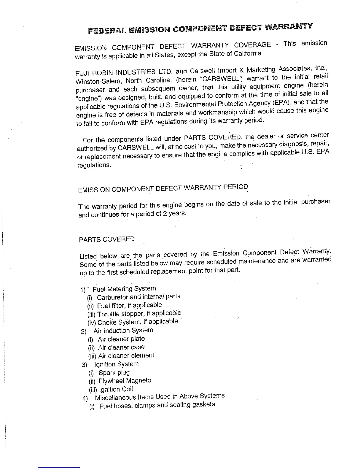 Robin NB2001 - FEDERAL EMISSION COMPONENT DEFECT WARRANTY; EMISSION COMPONENT DEFECT WARRANTY COVERAGE; EMISSION COMPONENT DEFECT WARRANTY PERIOD; PARTS COVERED
