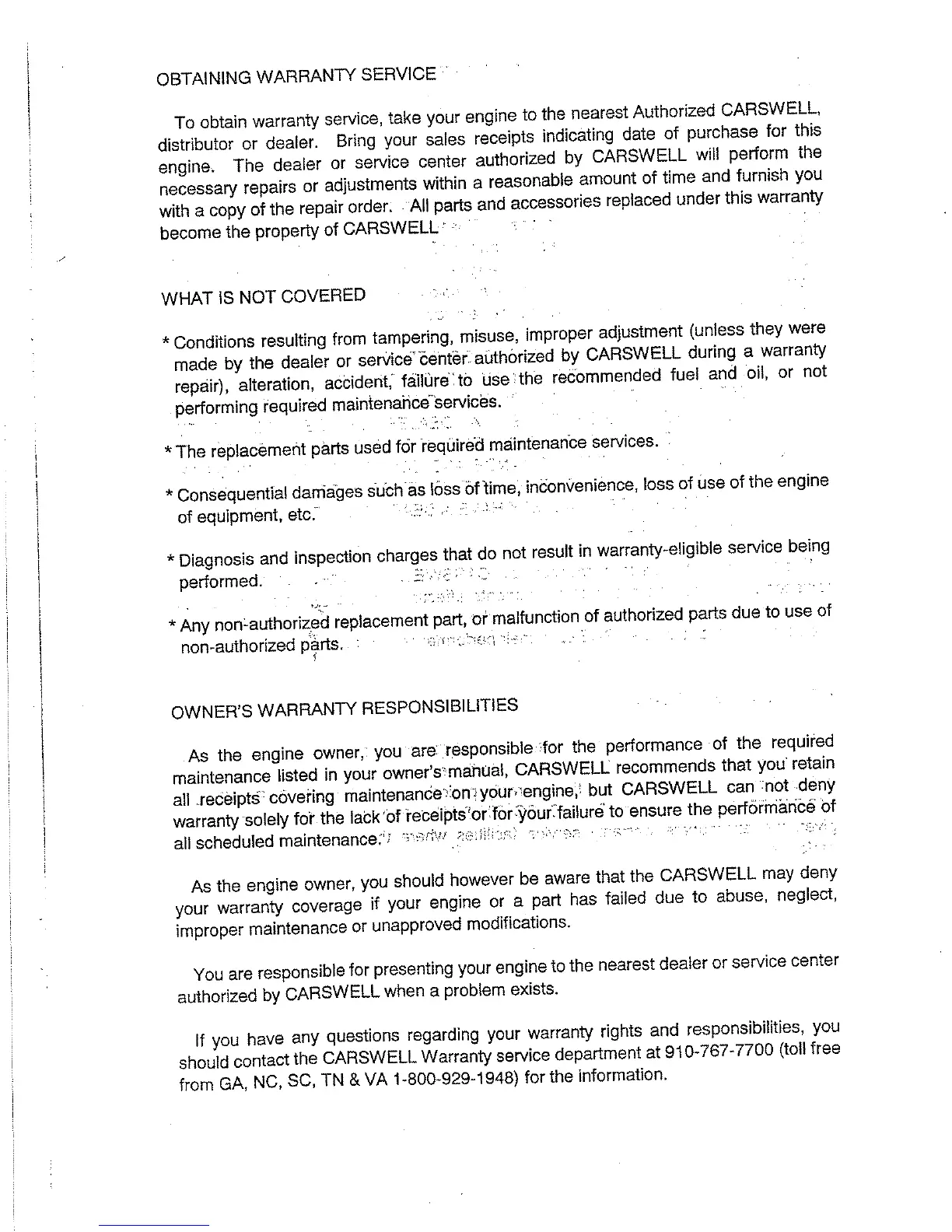 Robin NB2001 - OBTAINING WARRANTY SERVICE; To obtain warranty service, take your engine to the nearest Authorized CARSWELL, distributor or dealer.; WHAT IS NOT COVERED; Conditions resulting from tampering, misuse, improper adjustment...