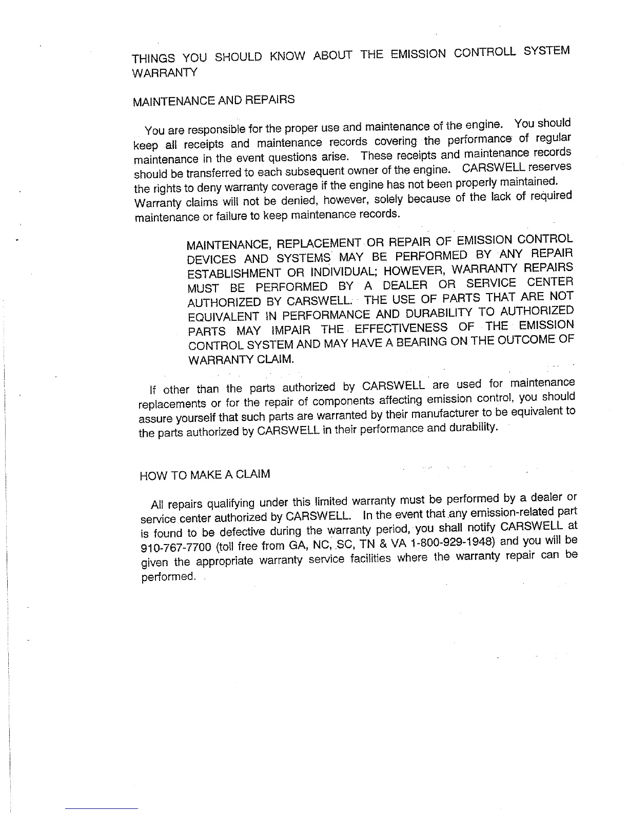 Robin NB2001 - THINGS YOU SHOULD KNOW ABOUT THE EMISSION CONTROLL SYSTEM WARRANTY; MAINTENANCE AND REPAIRS; MAINTENANCE, REPLACEMENT OR REPAIR OF EMISSION CONTROL DEVICES AND SYSTEMS MAY BE PERFORMED BY ANY REPAIR ESTABLISHMENT OR INDIVIDUAL; HOWEVER, WARRANTY REPAIRS MUST BE PERFORMED BY A DEALER OR SERVICE CENTER AUTHORIZED BY CARSWELL.; If other than the parts authorized by CARSWELL are used for maintenance replacements or for the repair of components affecting emission control, you should assure yourself that such parts are warranted by their manufacturer to be equivalent to the parts authorized by CARSWELL in their performance and durability.
