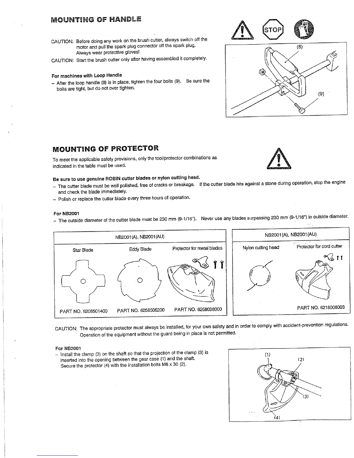 Robin NB2001 - MOUNTING OF HANDLE; For machines with Loop Handle; MOUNTING OF PROTECTOR; Be sure to use genuine ROBIN cutter blades or nylon cutting head.