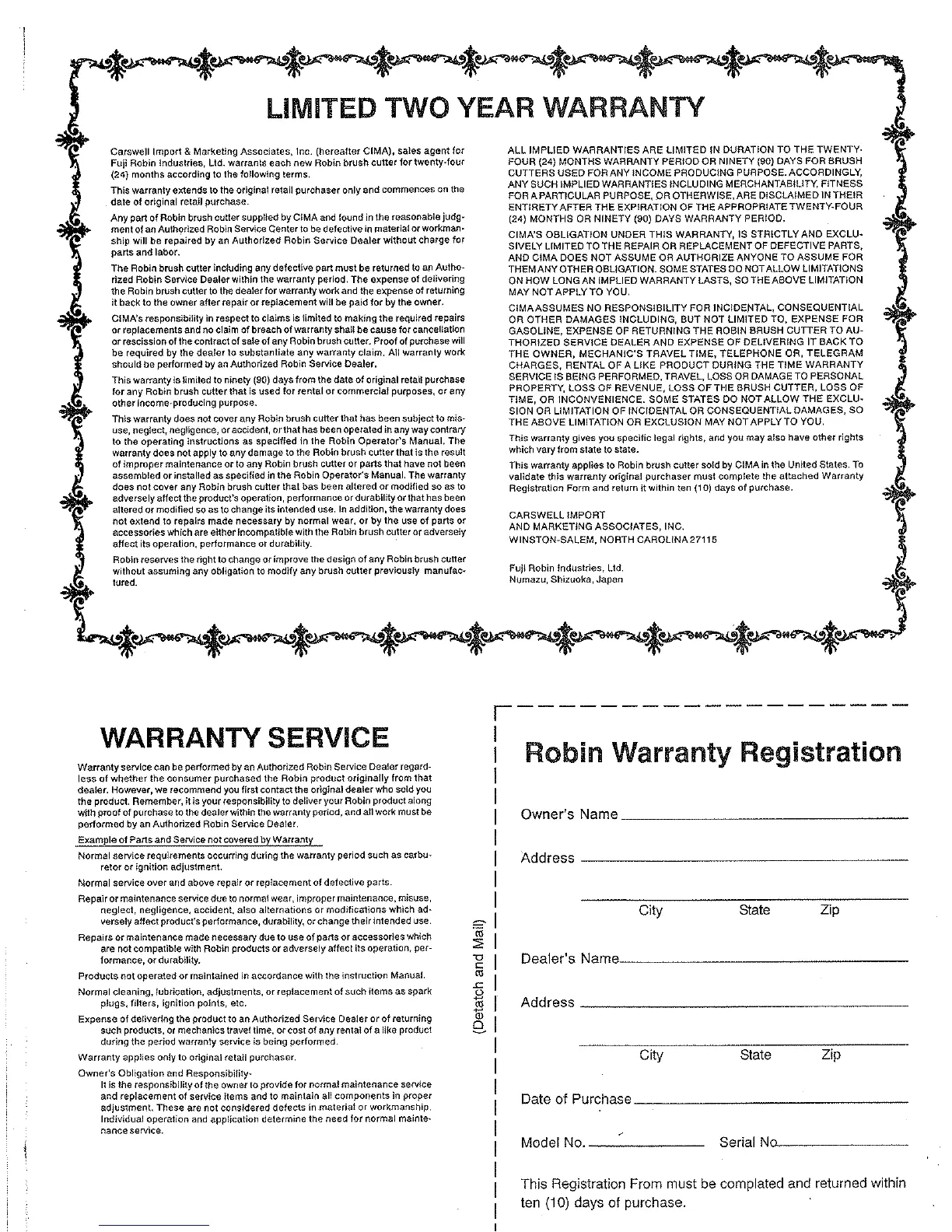 Robin NB2050 A - LIMITED TWO YEAR WARRANTY; WARRANTY SERVICE; Robin Warranty Registration