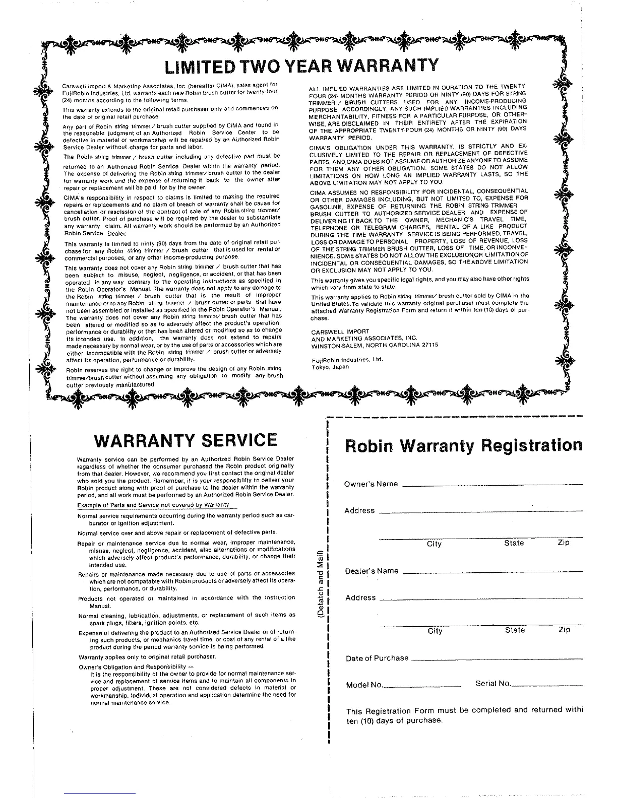 Robin NB221(AU) - LIMITED TWO YEAR WARRANTY; Warranty Terms and Exclusions; WARRANTY SERVICE INFORMATION; How to Obtain Service