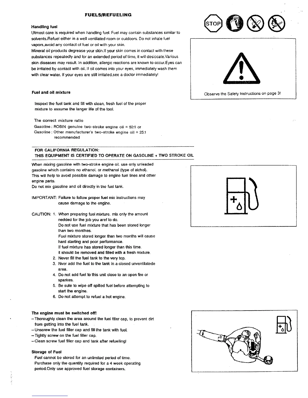 Robin NB223 - FUELS;REFUELING; Handling Fuel Safely; Fuel and Oil Mixture Guidelines