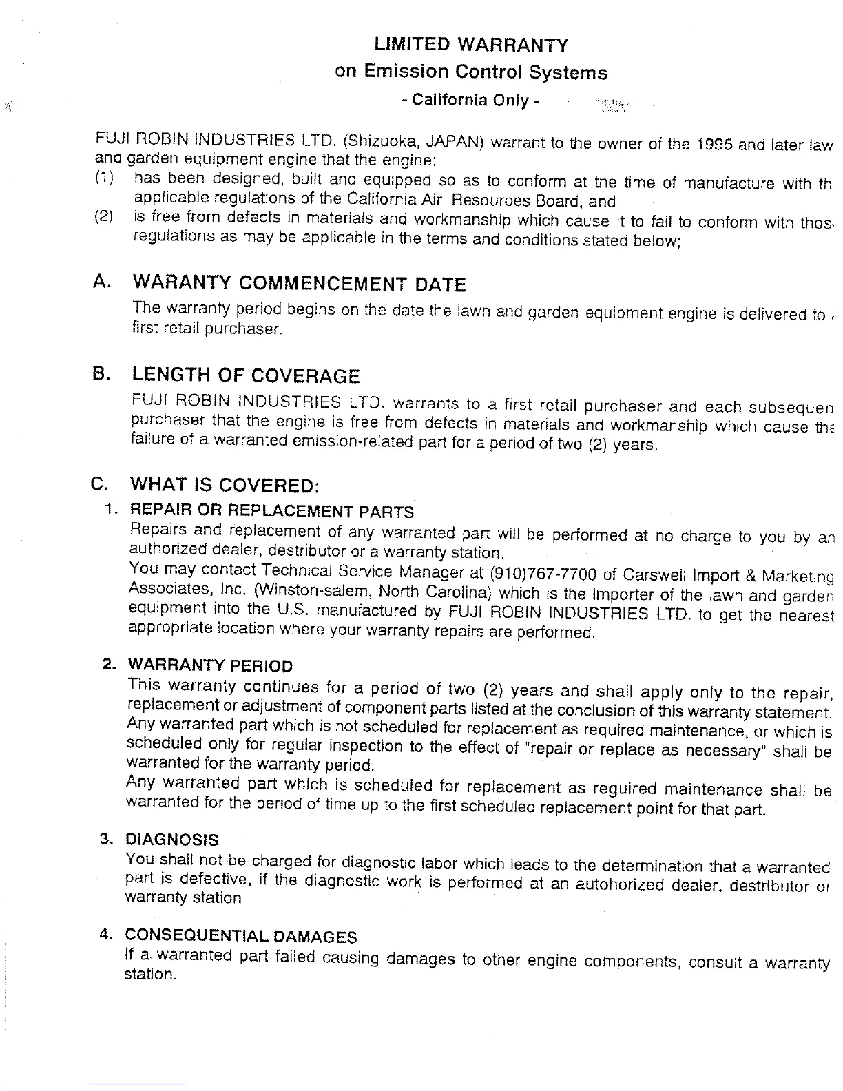 Robin NB223 - LIMITED WARRANTY - California Only; Warranty Commencement Date; Length of Coverage; Covered Parts