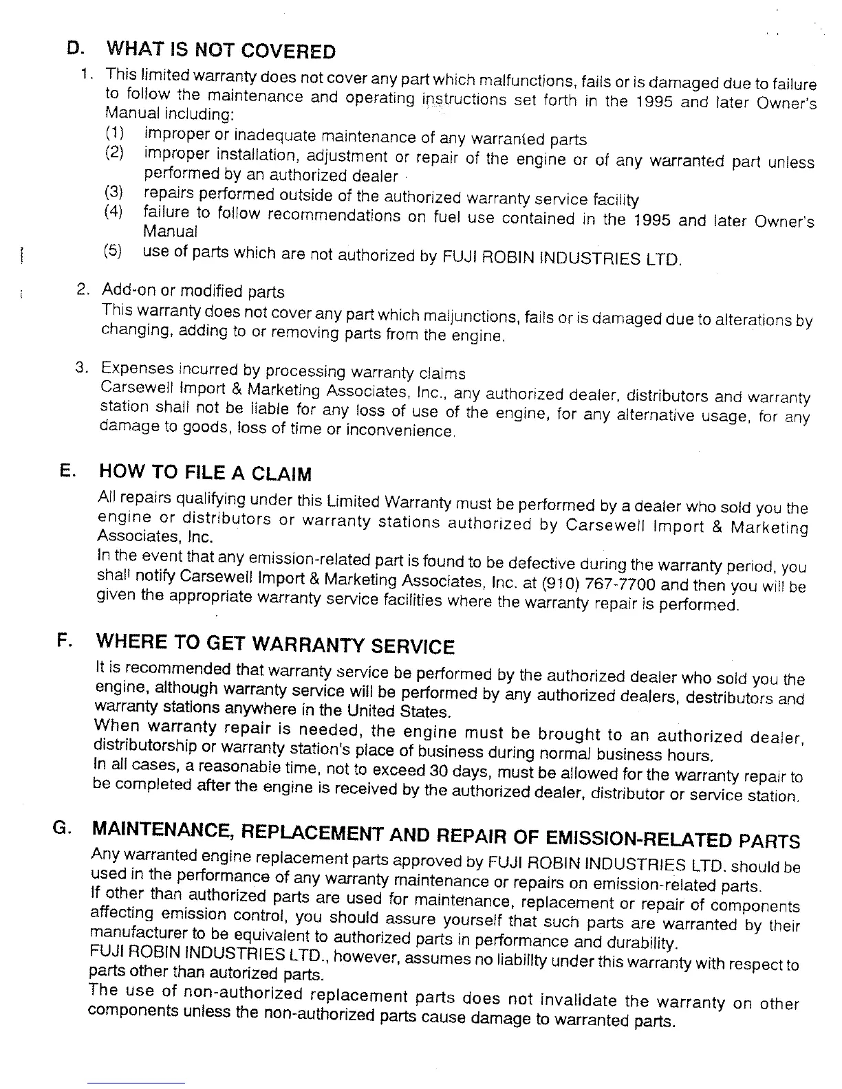 Robin NB223 - What is Not Covered; How to File a Claim; Warranty Service Locations; Emission-Related Parts Maintenance