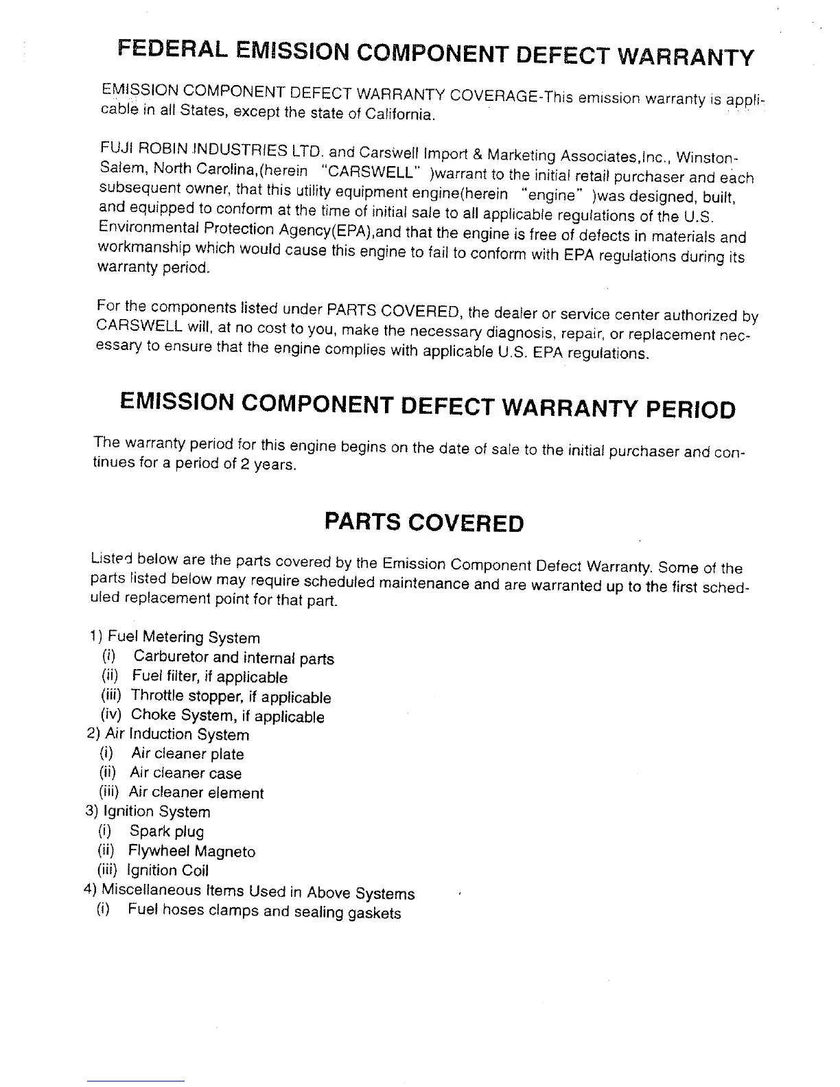 Robin NB223 - FEDERAL EMISSION COMPONENT DEFECT WARRANTY; Warranty Coverage; Warranty Period; Covered Parts