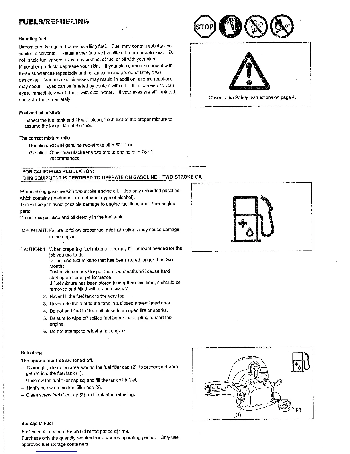 Robin NB2450 - Fuel and Refueling Guide; Handling Fuel Safely; Correct Fuel and Oil Mixture; Refueling Process