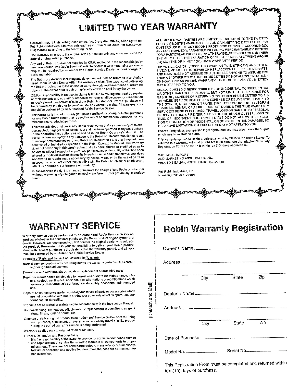 Robin NB2450 - Limited Two Year Product Warranty; Warranty Service Procedures