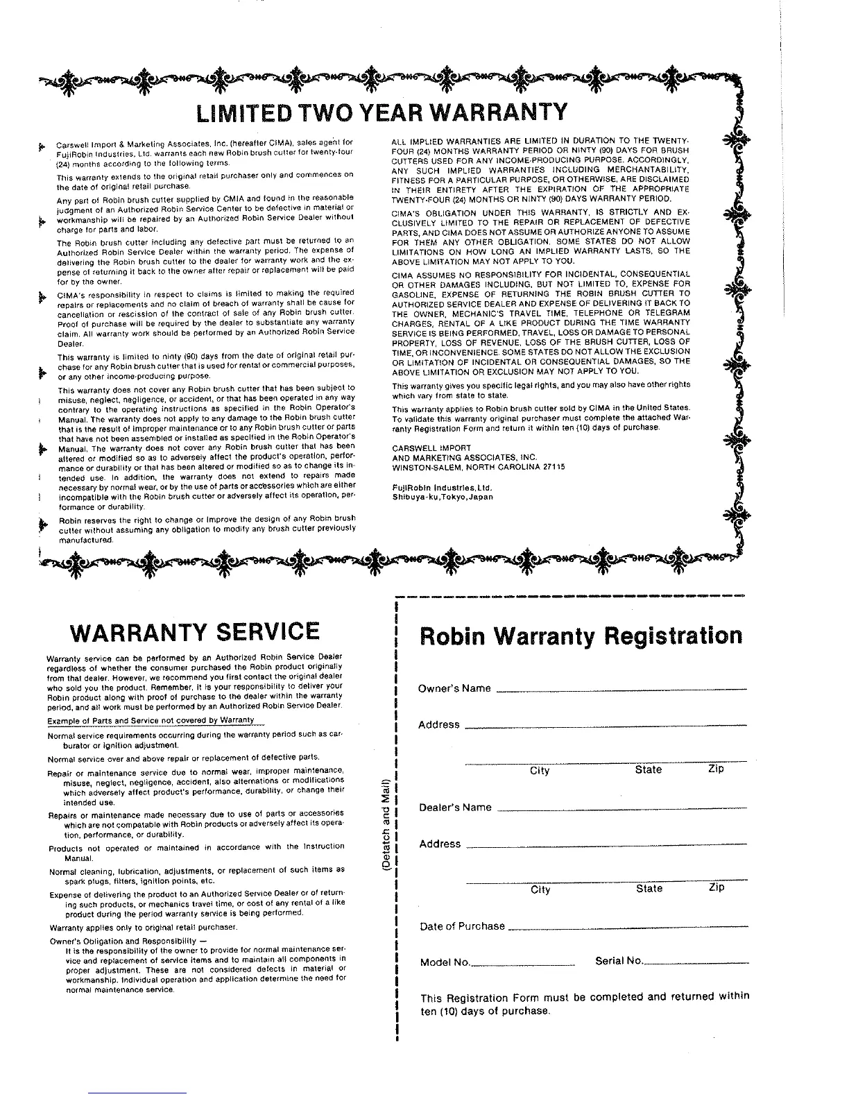 Robin NB281 - Limited Two Year Warranty; Warranty Service Information