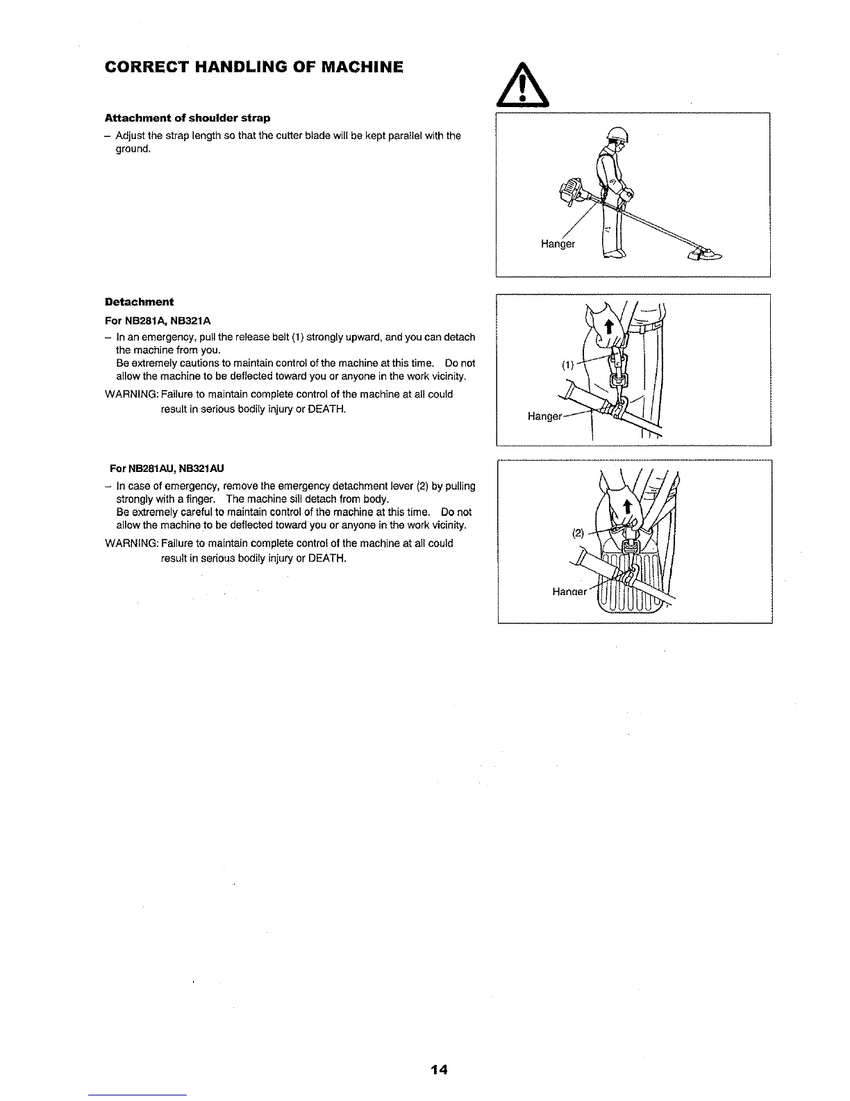 Robin NB321 - Machine Handling and Emergency Detachment; Shoulder Strap Attachment; Emergency Detachment