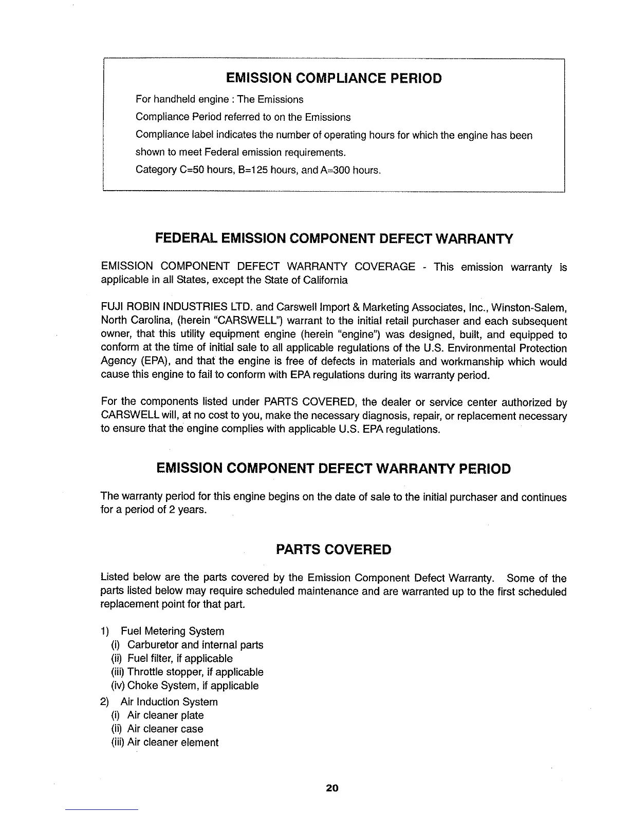 Robin NB321 - Emission Control System Warranty; Emission Compliance Period; Warranty Coverage and Period; Covered Parts List