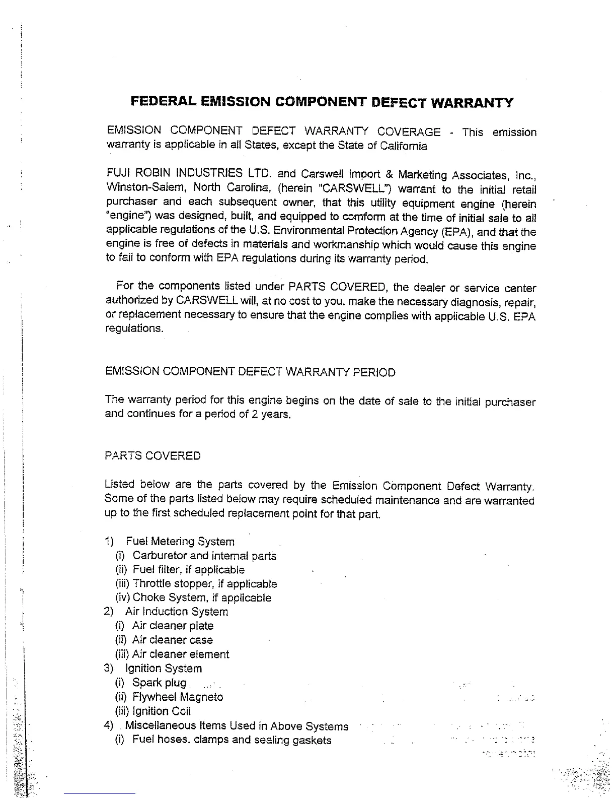Robin NB351 - Federal Emission Component Defect Warranty Details; Emission Component Defect Warranty Coverage; Emission Component Defect Warranty Period; Parts Covered