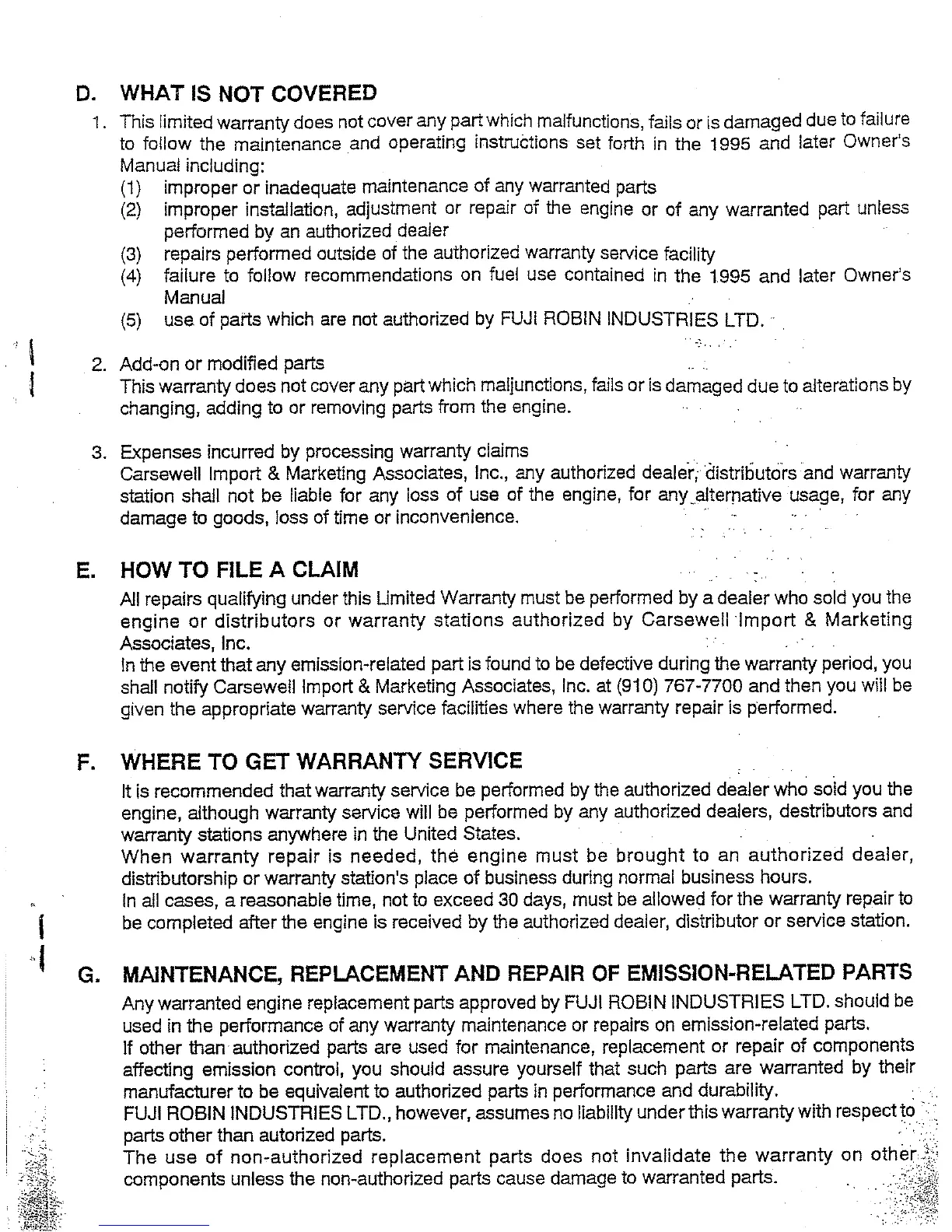 Robin NB411 - Warranty Claims and Service; Exclusions, Claims, and Service Locations