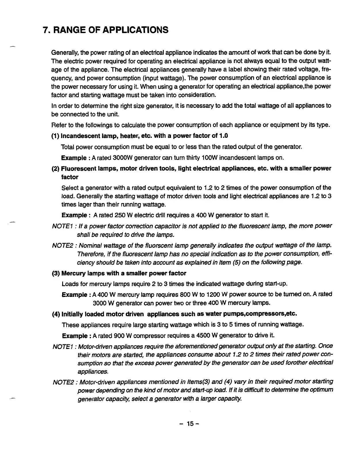 load. Generally the starting wattage of motor driven tools and light electrical appliances are