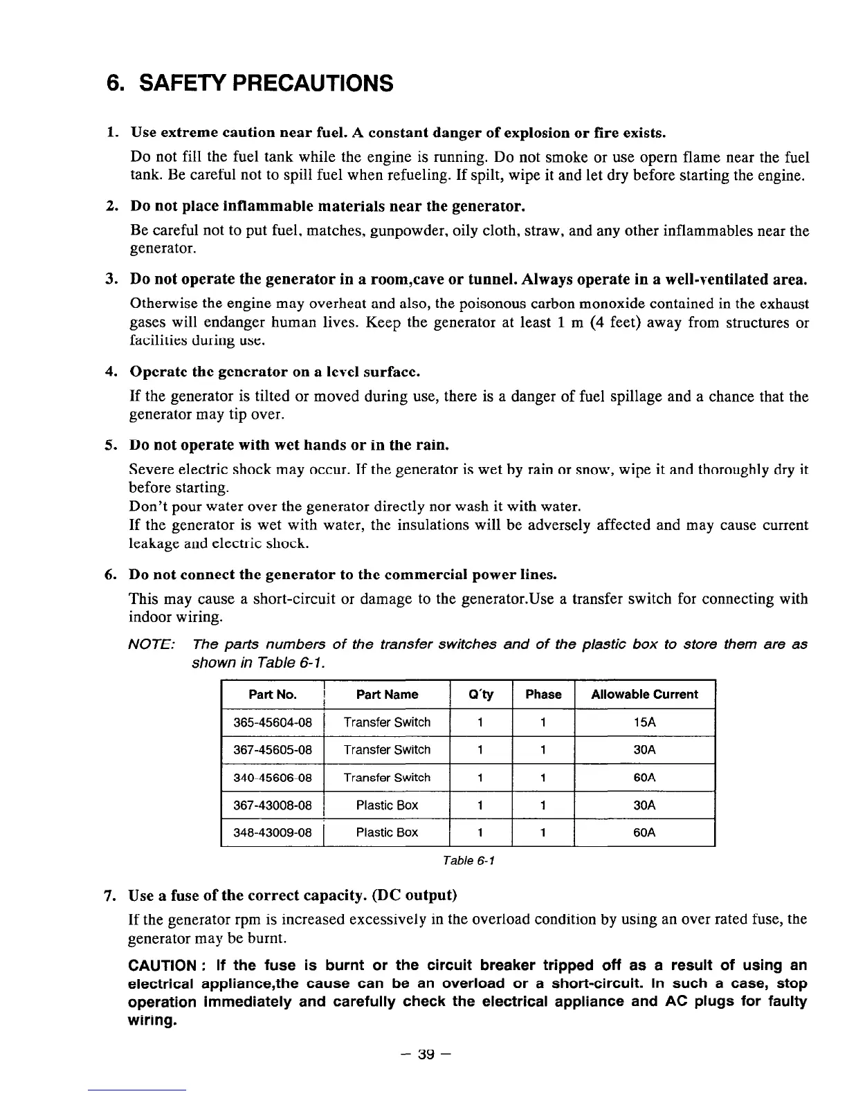 Severe electric shock may occur. If the generator is wet by rain or snow, wipe it and thoroughly dry it