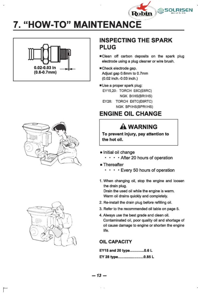 Robin SOLRISEN EY15D - HOW-TO MAINTENANCE PROCEDURES; INSPECTING THE SPARK PLUG; ENGINE OIL CHANGE PROCEDURE; ENGINE OIL CAPACITY