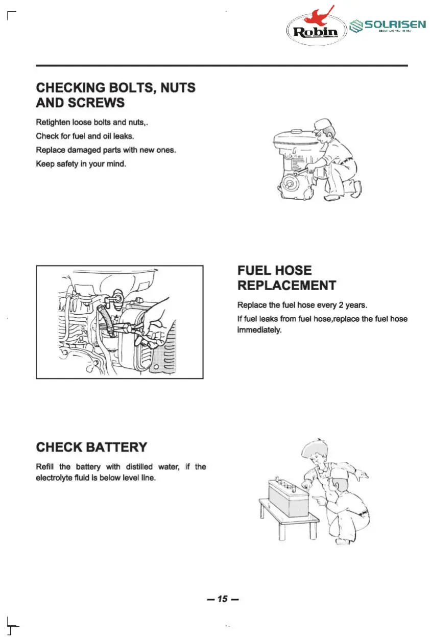 Robin SOLRISEN EY15D - ENGINE CHECKS AND REPLACEMENTS; CHECKING BOLTS, NUTS AND SCREWS; FUEL HOSE REPLACEMENT; BATTERY MAINTENANCE