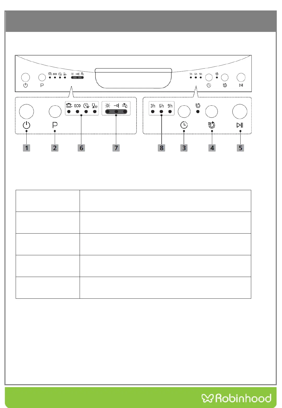 1 Power Press this button to turn on your dishwasher, the screen