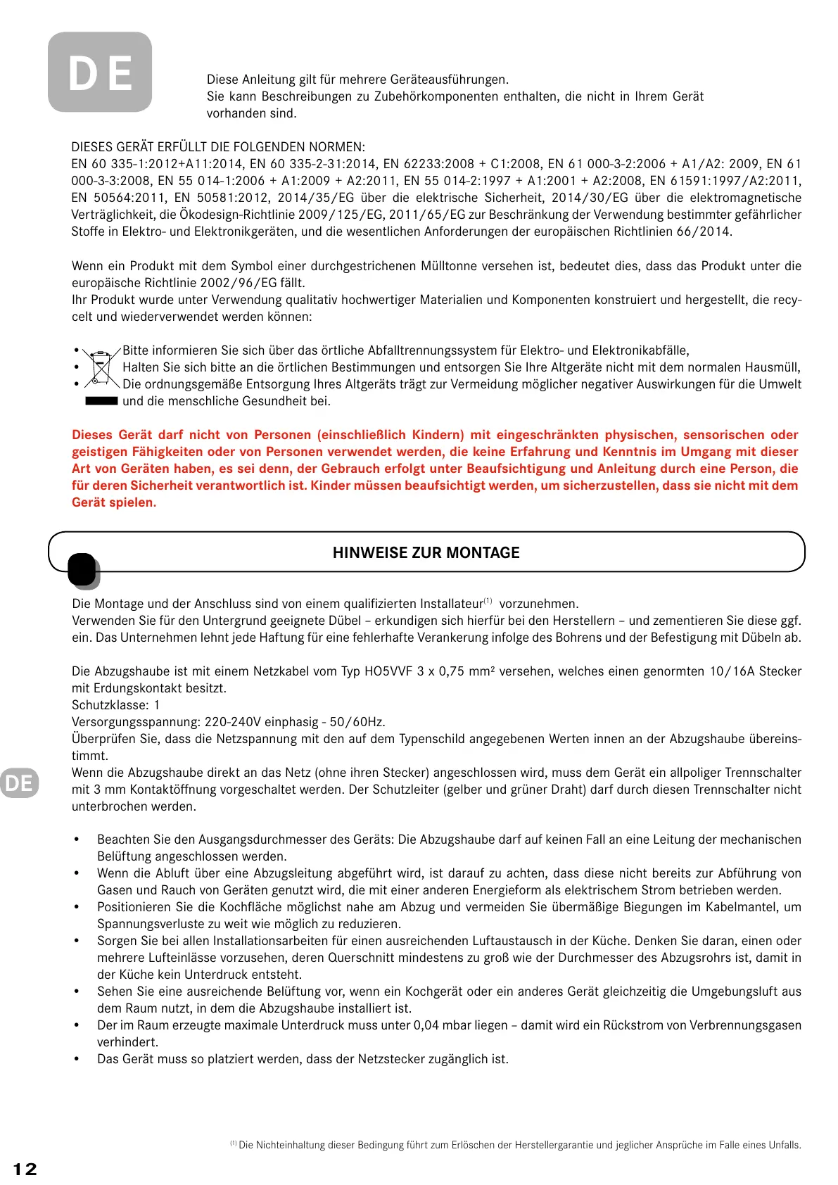 Die Montage und der Anschluss sind von einem qualifizierten Installateur