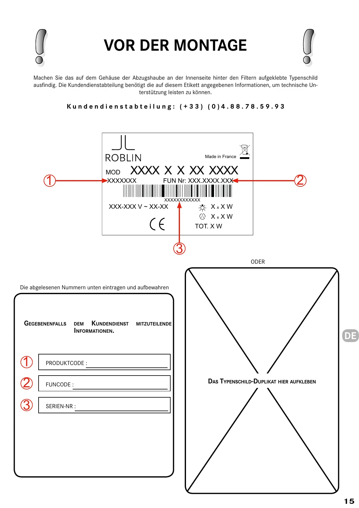 Machen Sie das auf dem Gehäuse der Abzugshaube an der Innenseite hinter den Filtern aufgeklebte Typenschild